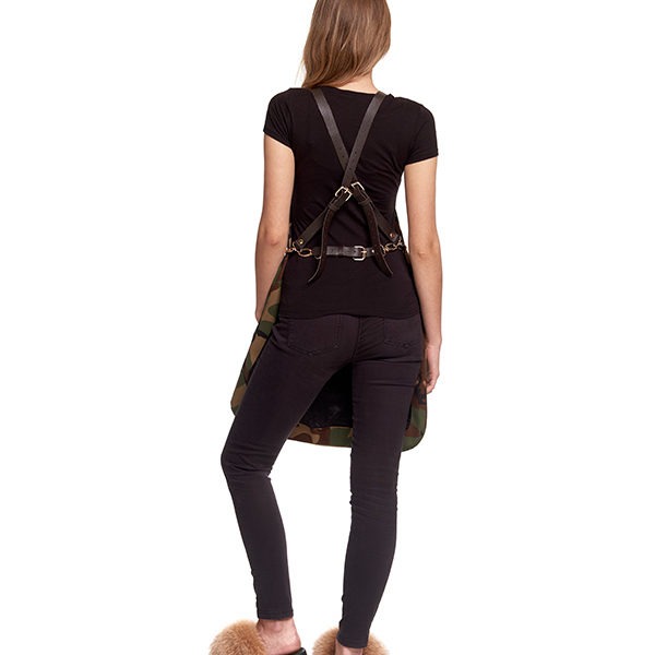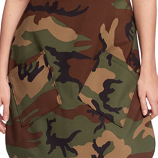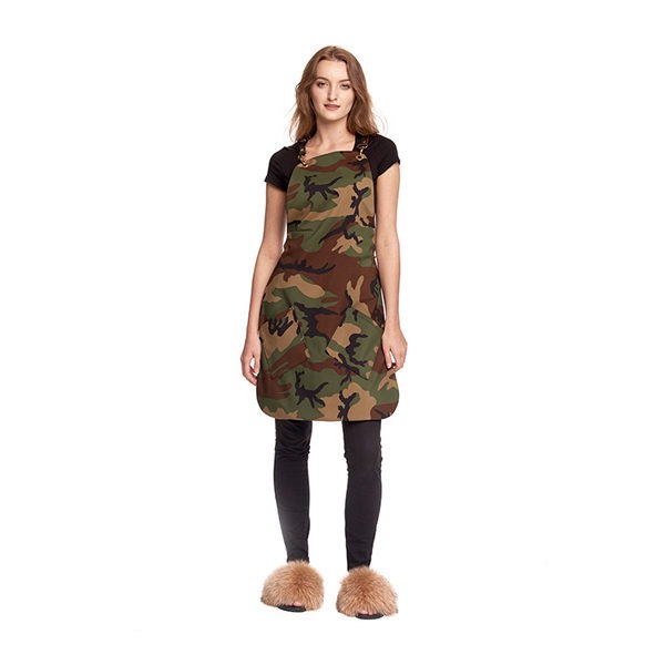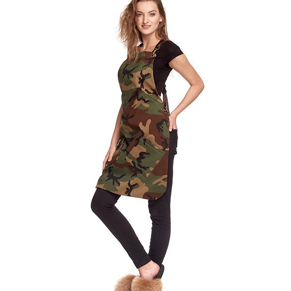 Designerski fartuch w stylu militarnym. Wykonany z wysokiej jakości materiałów. Dopracowane detale. Dwie kieszenie w kolorze moro.